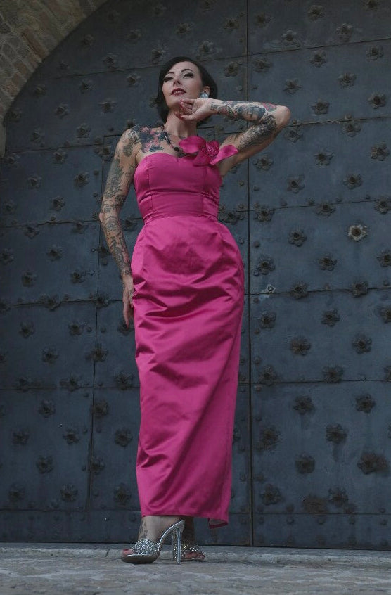 L’abito lungo “Betzy” in seta shantung è ispirato al glamour senza tempo degli anni ’50, questo abito celebra la femminilità con dettagli sartoriali unici.