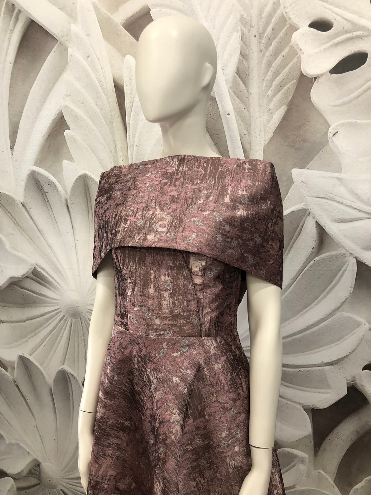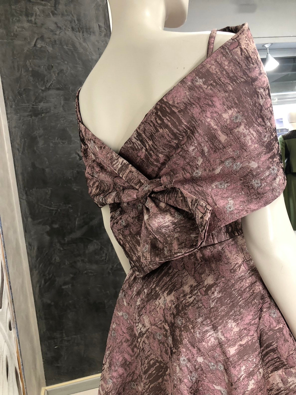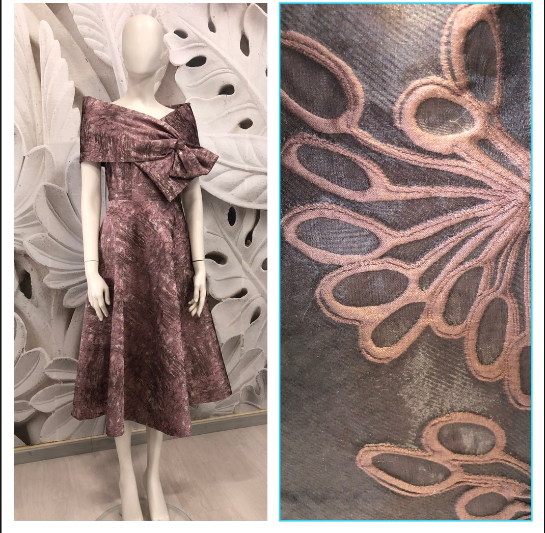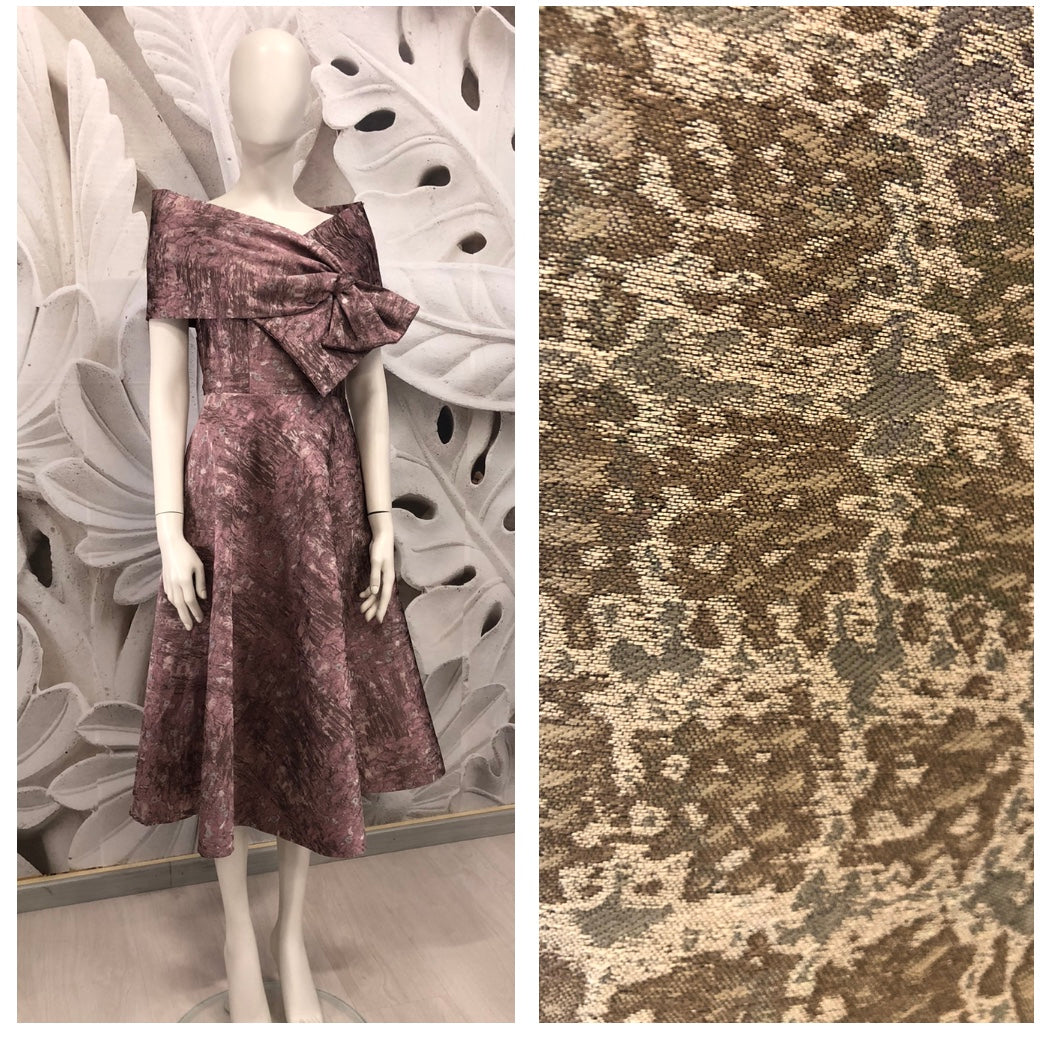 Abito ispirato alla raffinata eleganza degli anni ’50, con scollo a cuore e stola coordinata, realizzato in uno splendido broccato deadstock proveniente dall’alta moda. Disponibile in due varianti: su base rosata oppure su base marrone/grigio. La disponibilità è limitata, trattandosi di tessuti unici e irripetibili.