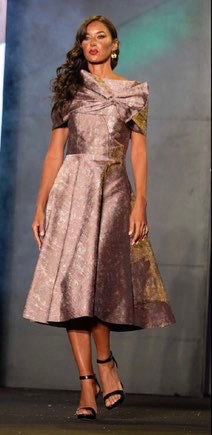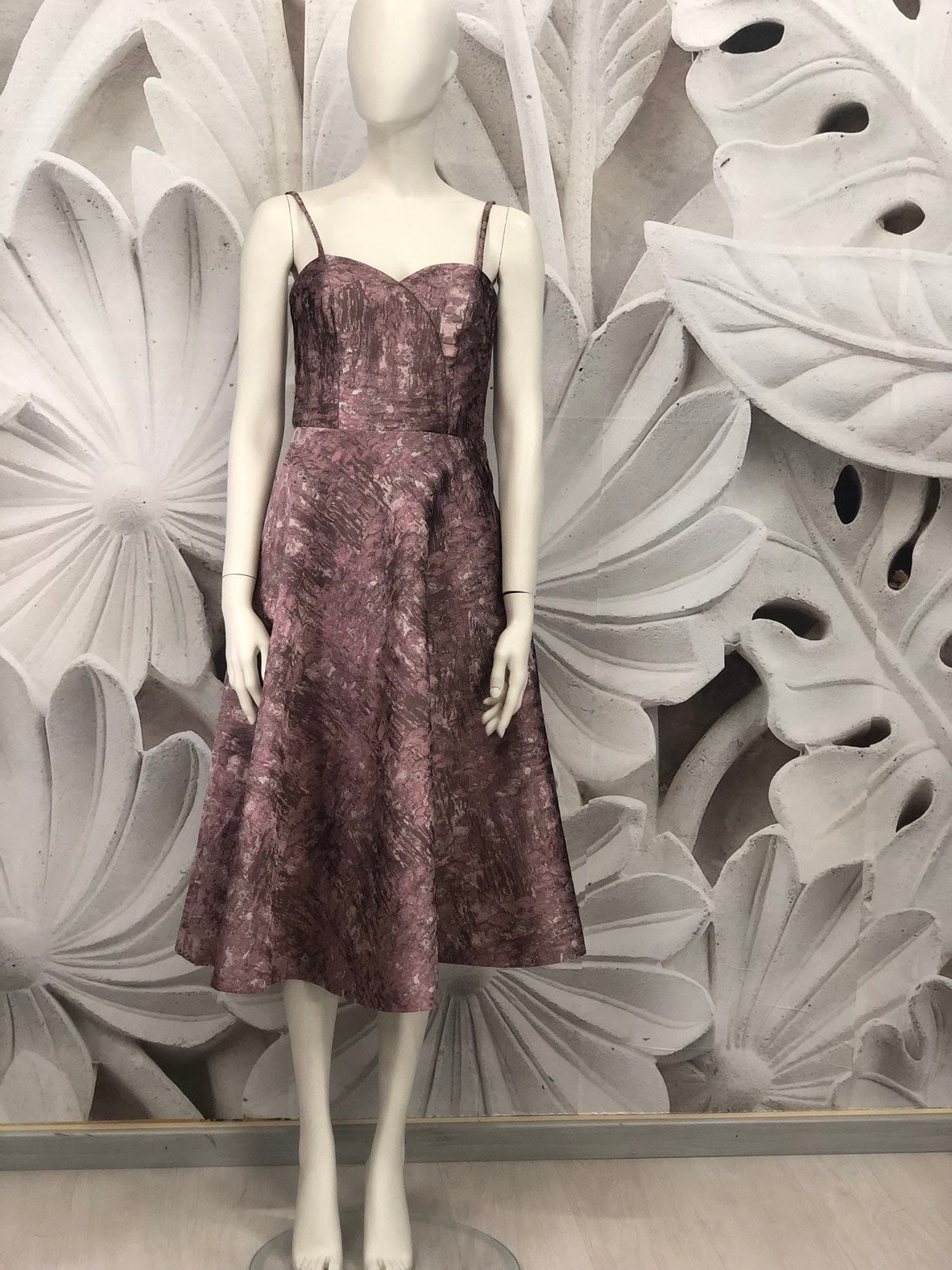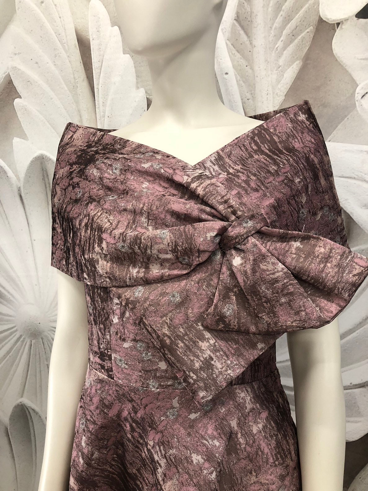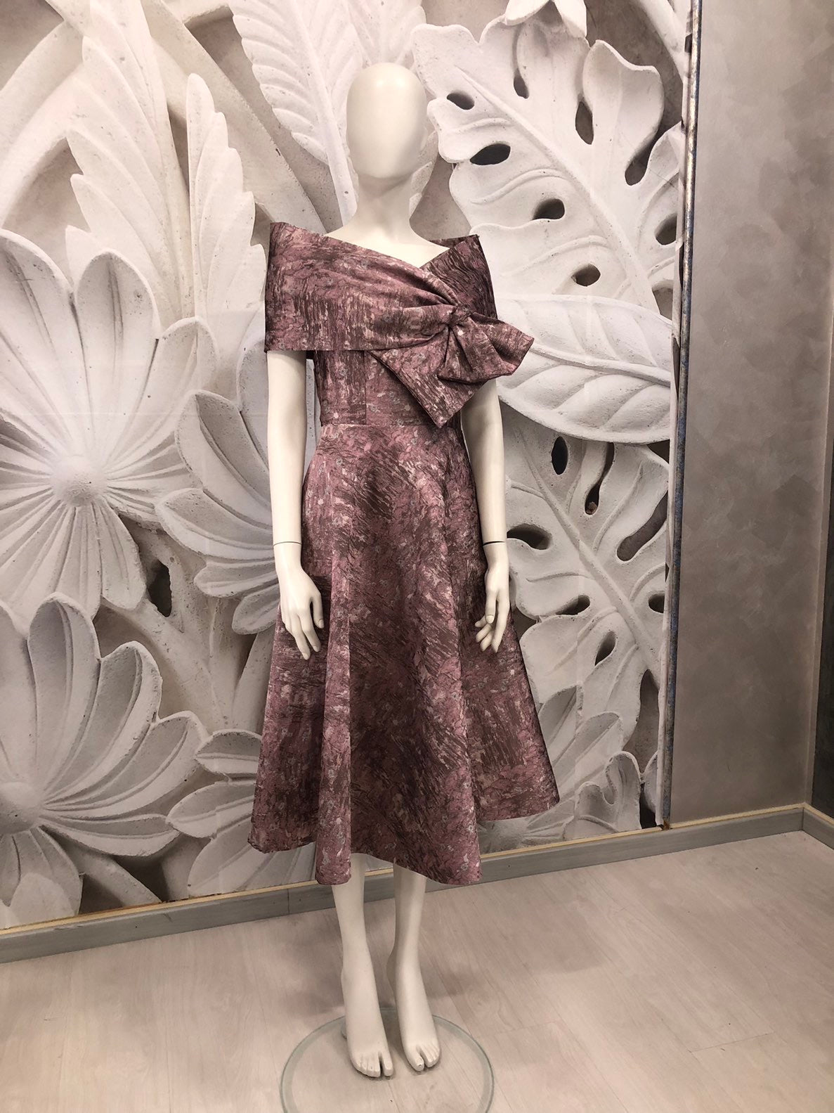 Abito ispirato alla raffinata eleganza degli anni ’50, con scollo a cuore e stola coordinata, realizzato in uno splendido broccato deadstock proveniente dall’alta moda. Disponibile in due varianti: su base rosata oppure su base marrone/grigio. La disponibilità è limitata, trattandosi di tessuti unici e irripetibili.
