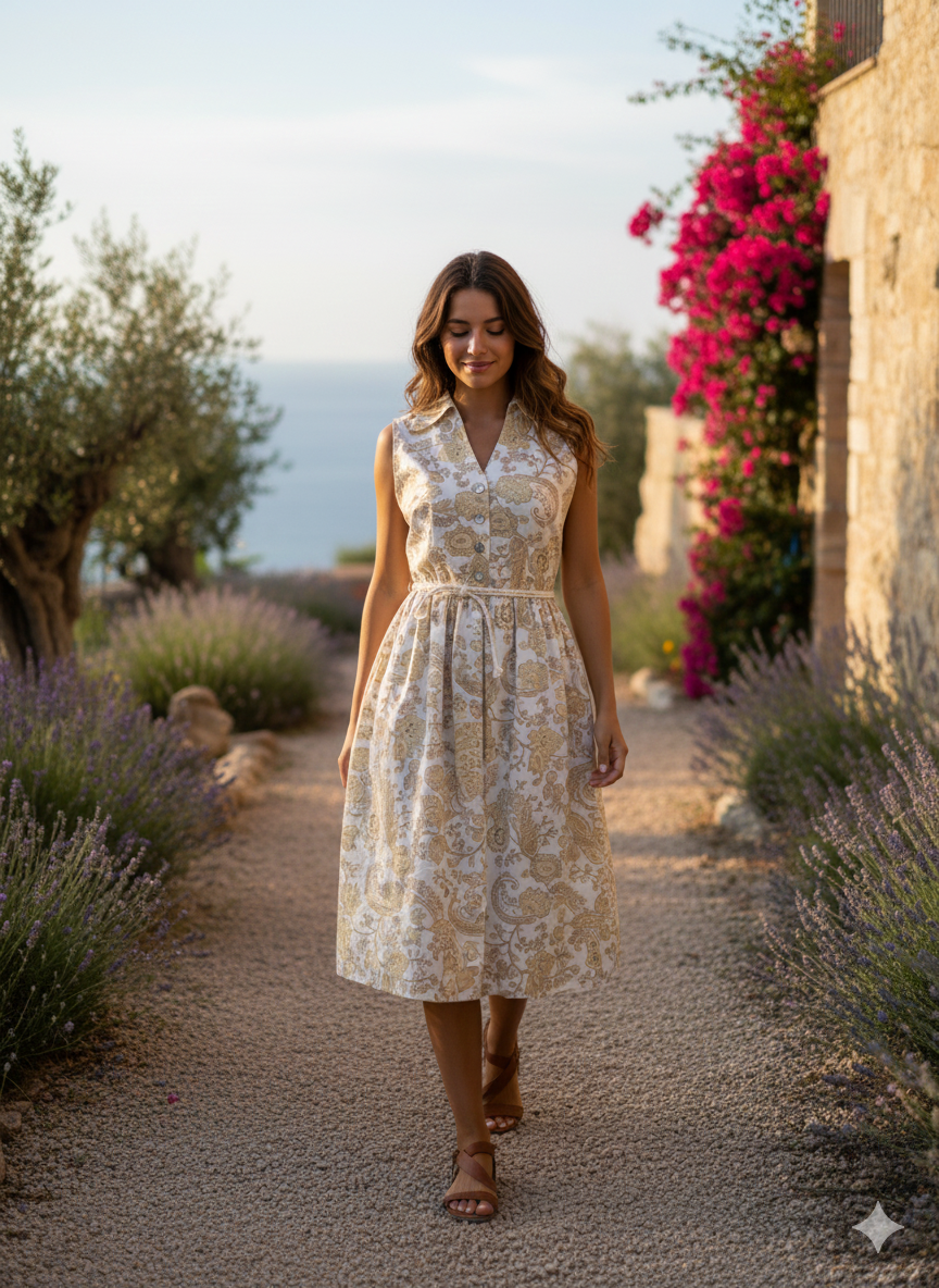 Scopri l'abito Rita in cotone vintagestyle anni 50, un'icona di moda sostenibile realizzato in tessuto vintage misto cotone proveniente da tessuti di deadstock.