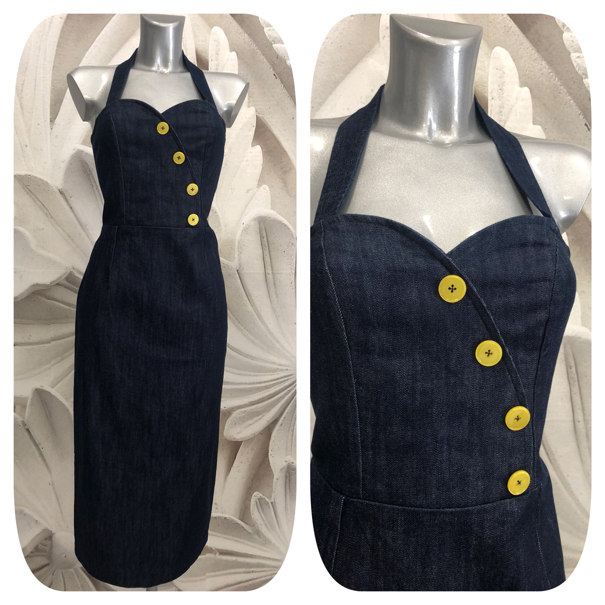 Abito tubino ispirato agli anni 50 realizzato in tessuto denim blu scuro. Chiusura dietro con zip. Allacciatura bretelle all'americana (al collo) o incrociate dietro. applicazione bottoni gialli sul top davanti. Gonna tubino lunghezza midi con spacco dietro. Realizzato su misura con l’utilizzo di tessuti denim di deadstock con disponibilità limitata, questo permette di dare unicità al capi poiché ogni abito realizzati con tessuto denim mai uguale lo rende un pezzo unico. Possibilità di scegliere il colore dei bottoni.