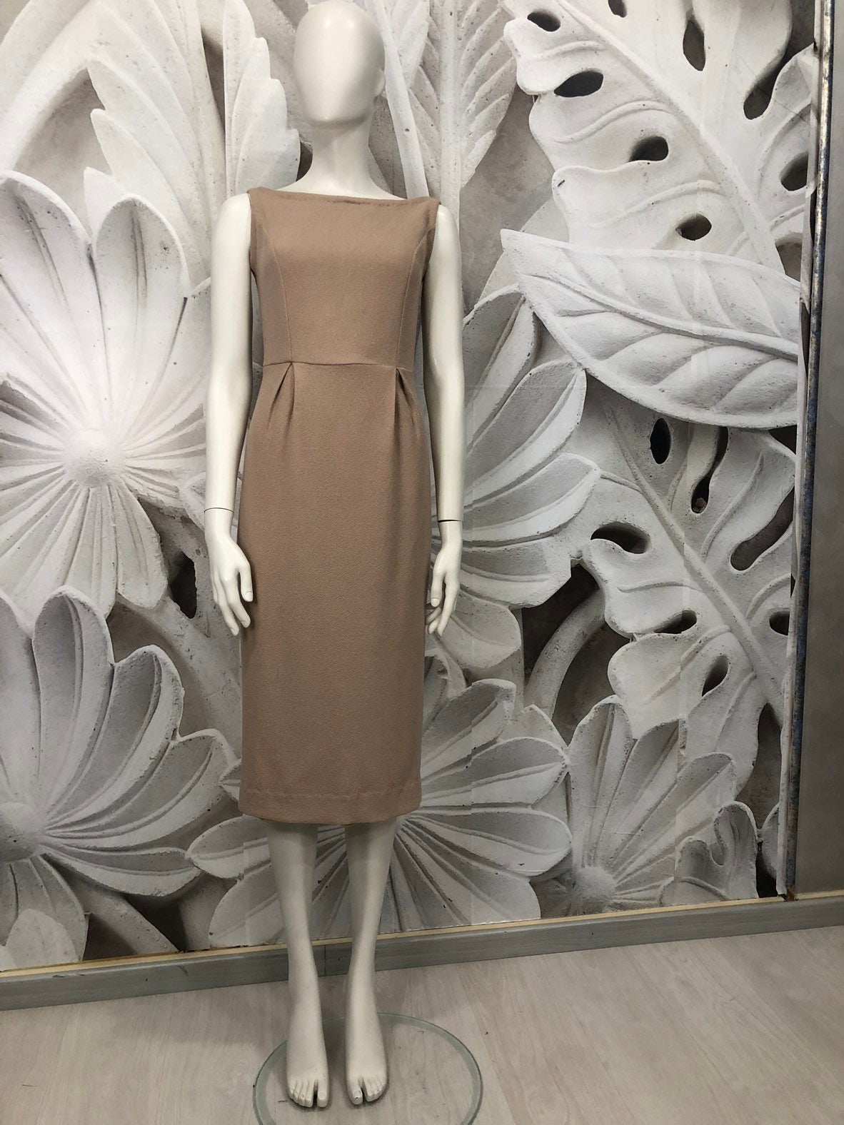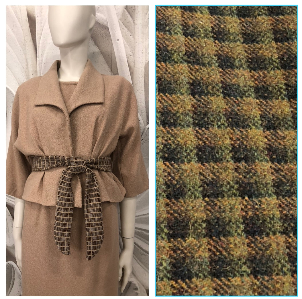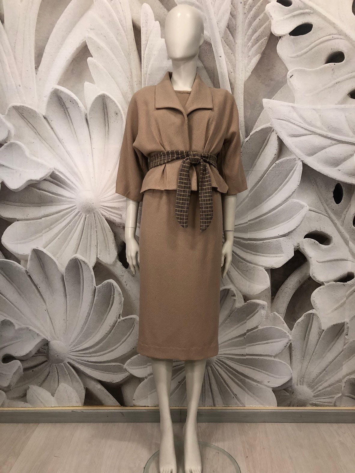 Il completo Kelly, ispirato all’eleganza senza tempo degli anni ’50, è composto da un raffinato tubino smanicato con scollo a barca e lunghezza midi, abbinato a una giacca con maniche a kimono da stringere in vita con cintura. Realizzato in pregiato crepe beige deadstock proveniente dall’alta moda, può essere personalizzato scegliendo tra altre varianti di tessuto deadstock: verde oliva, marrone oppure un sofisticato motivo a scacchi nei toni marrone/verde. Essendo tessuti deadstock la disponibilità e’ limitata.