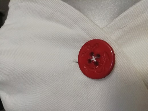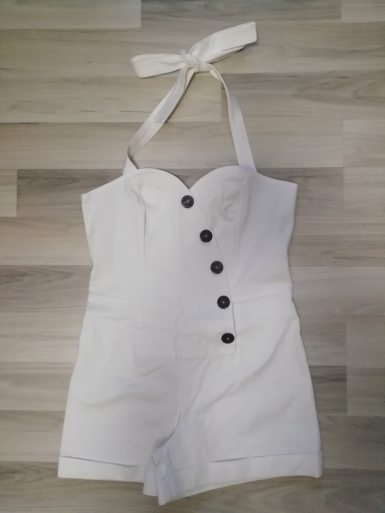 Salopette corta ispirata ad uno stile anni 40. Allacciatura sul davanti con bottoni marinari con ancora. Scollo a cuore e bretelle con all'americana. Realizzata in tessuto jeans bianco (cotone 100%). Orlo con risvolto